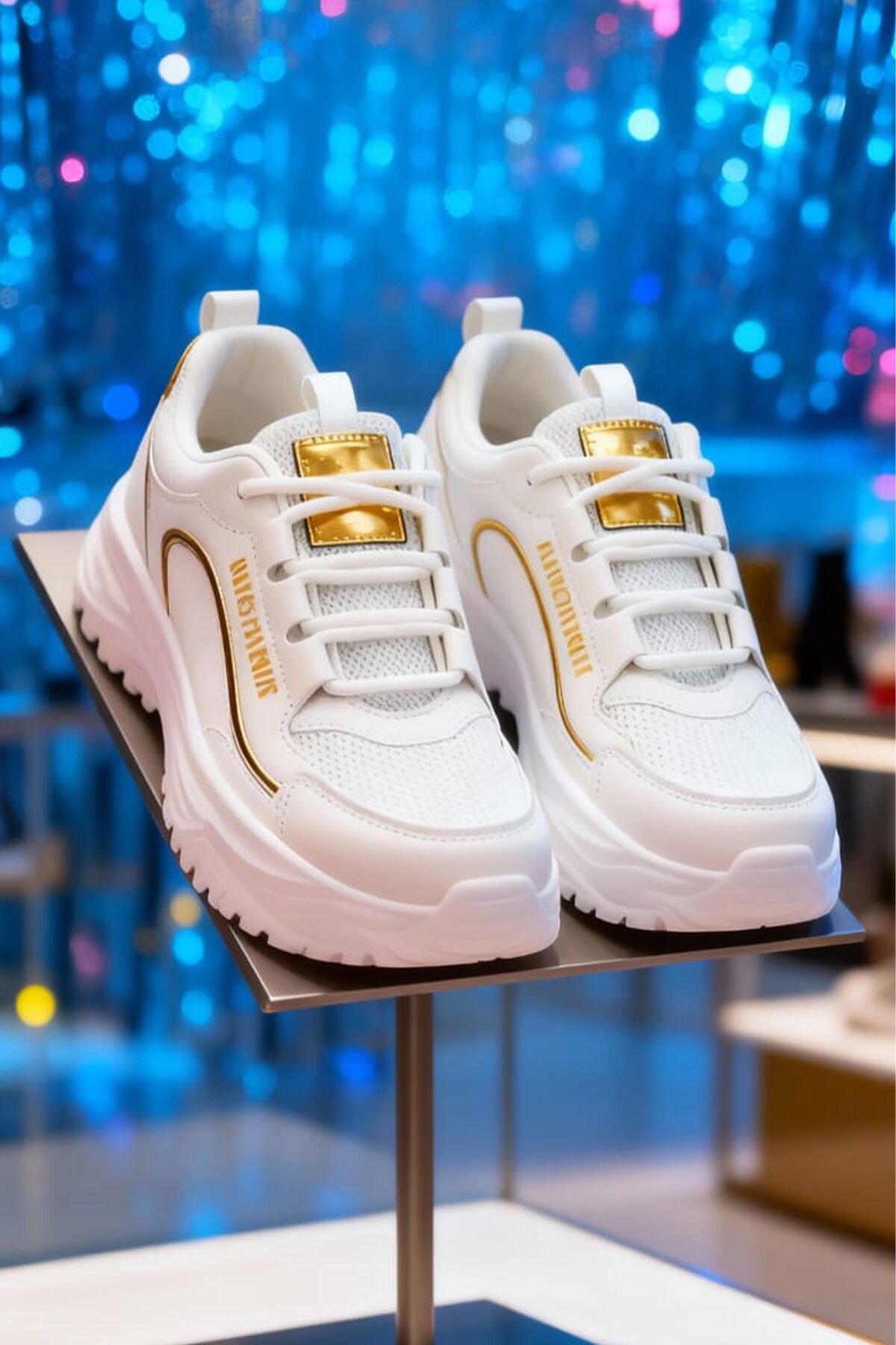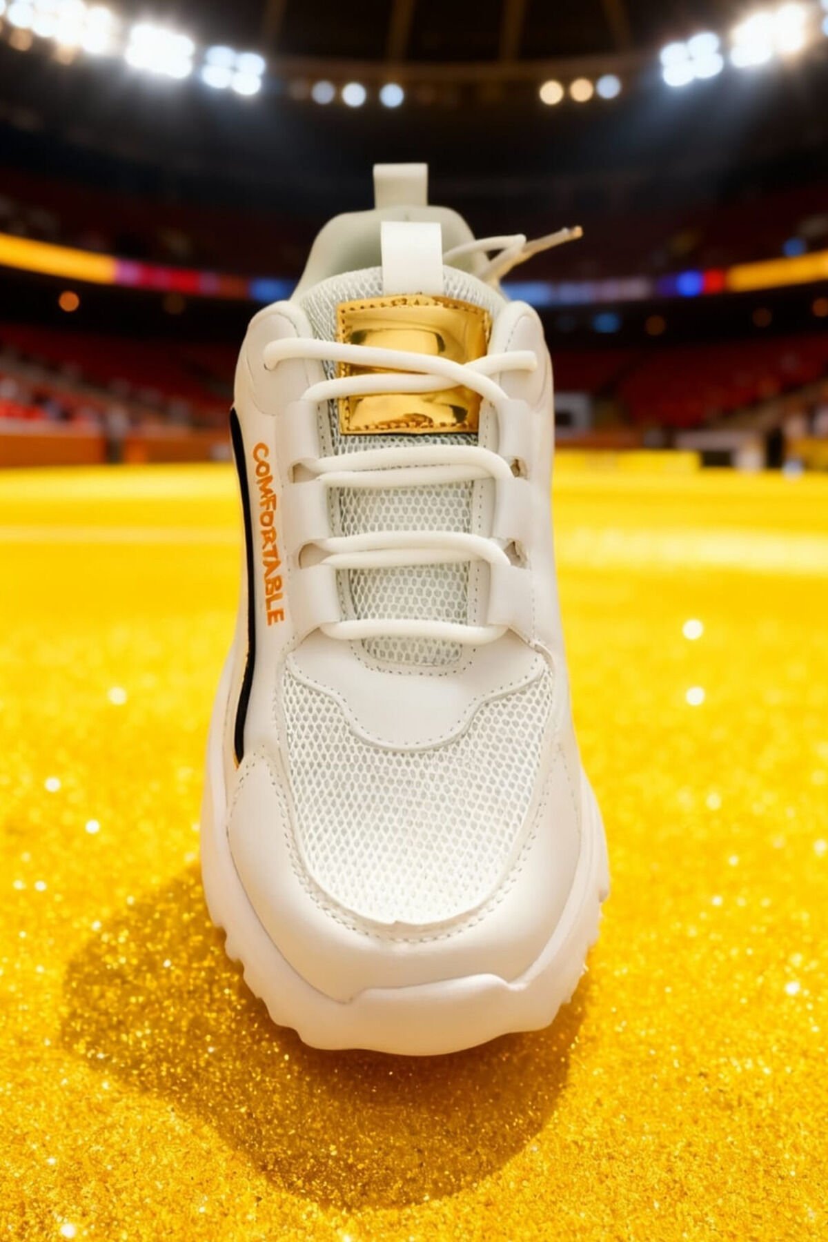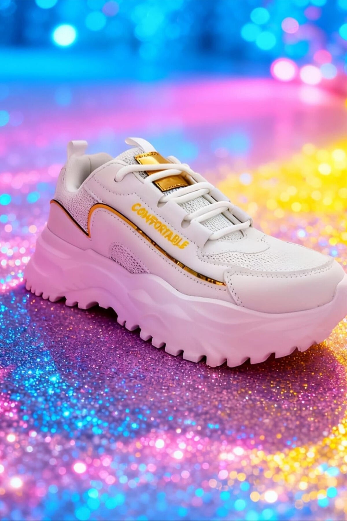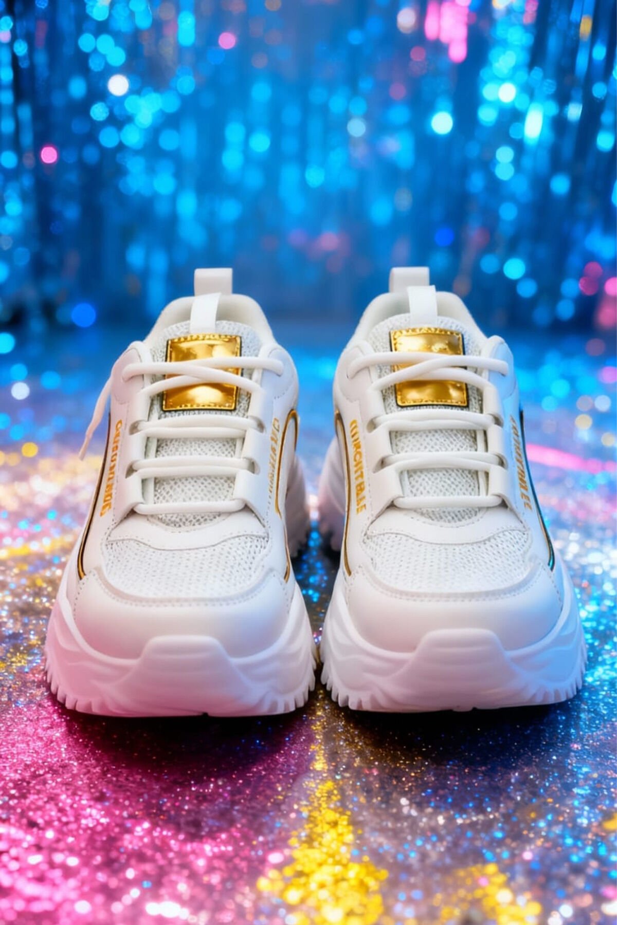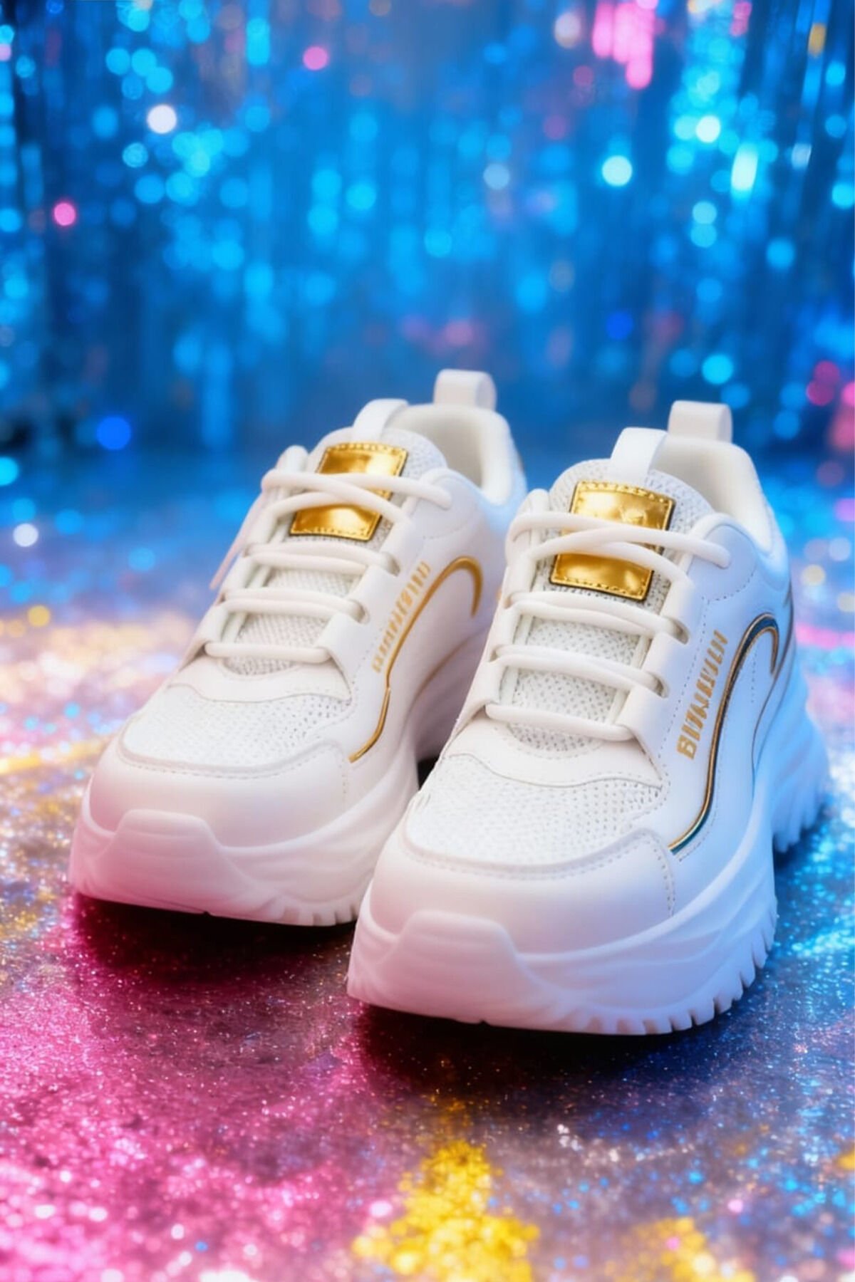 Beyaz Kalın Tabanlı Spor Ayakkabı – Altın Detaylı, Rahat ve Şık