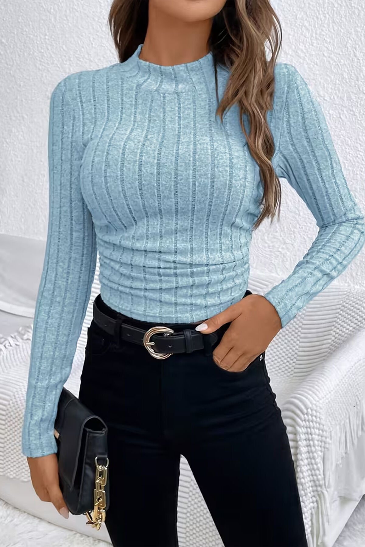 Kadın Açık Mavi Fitilli Crop Triko Kazak – Uzun Kollu, Bisiklet Yaka, Esnek Kumaş