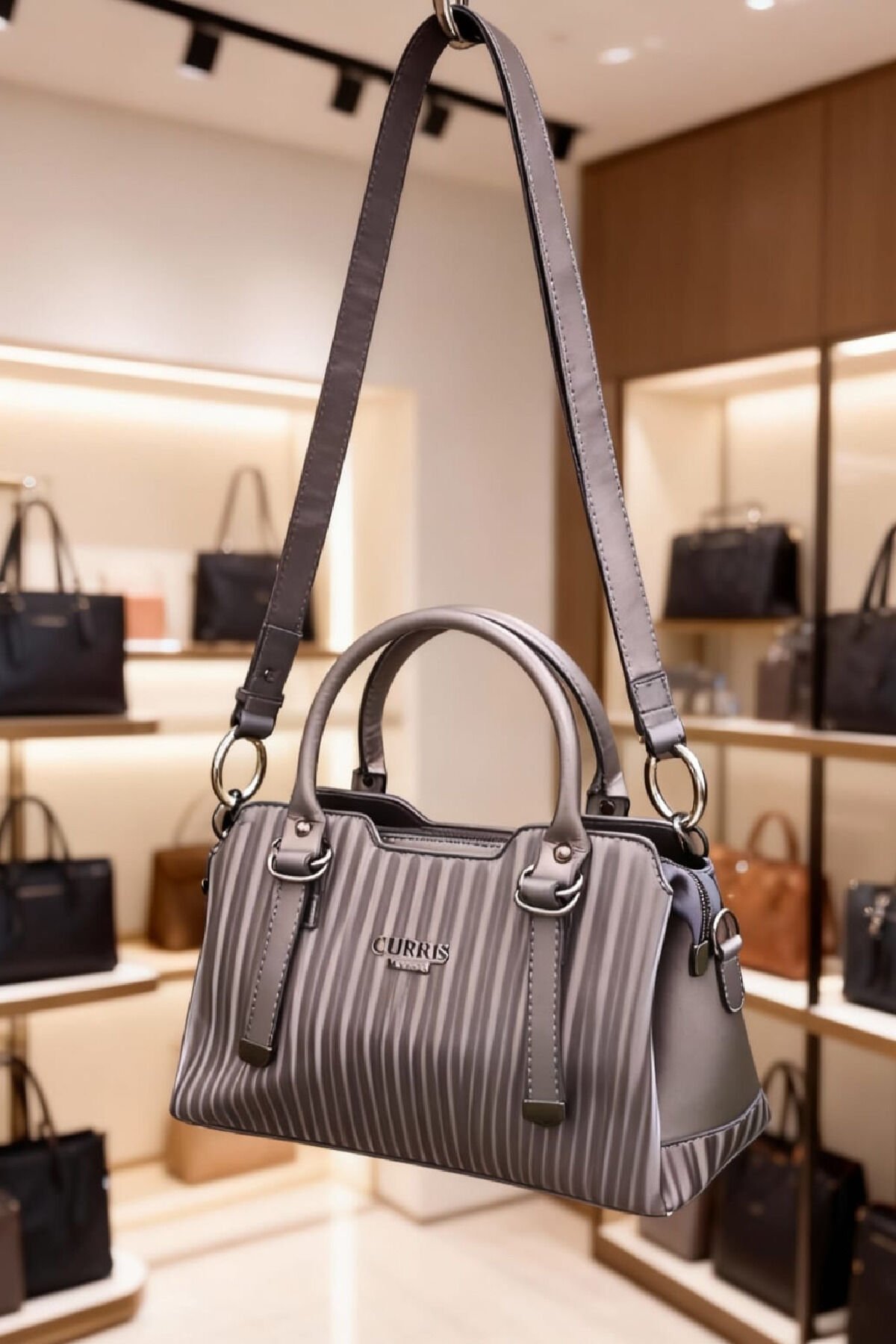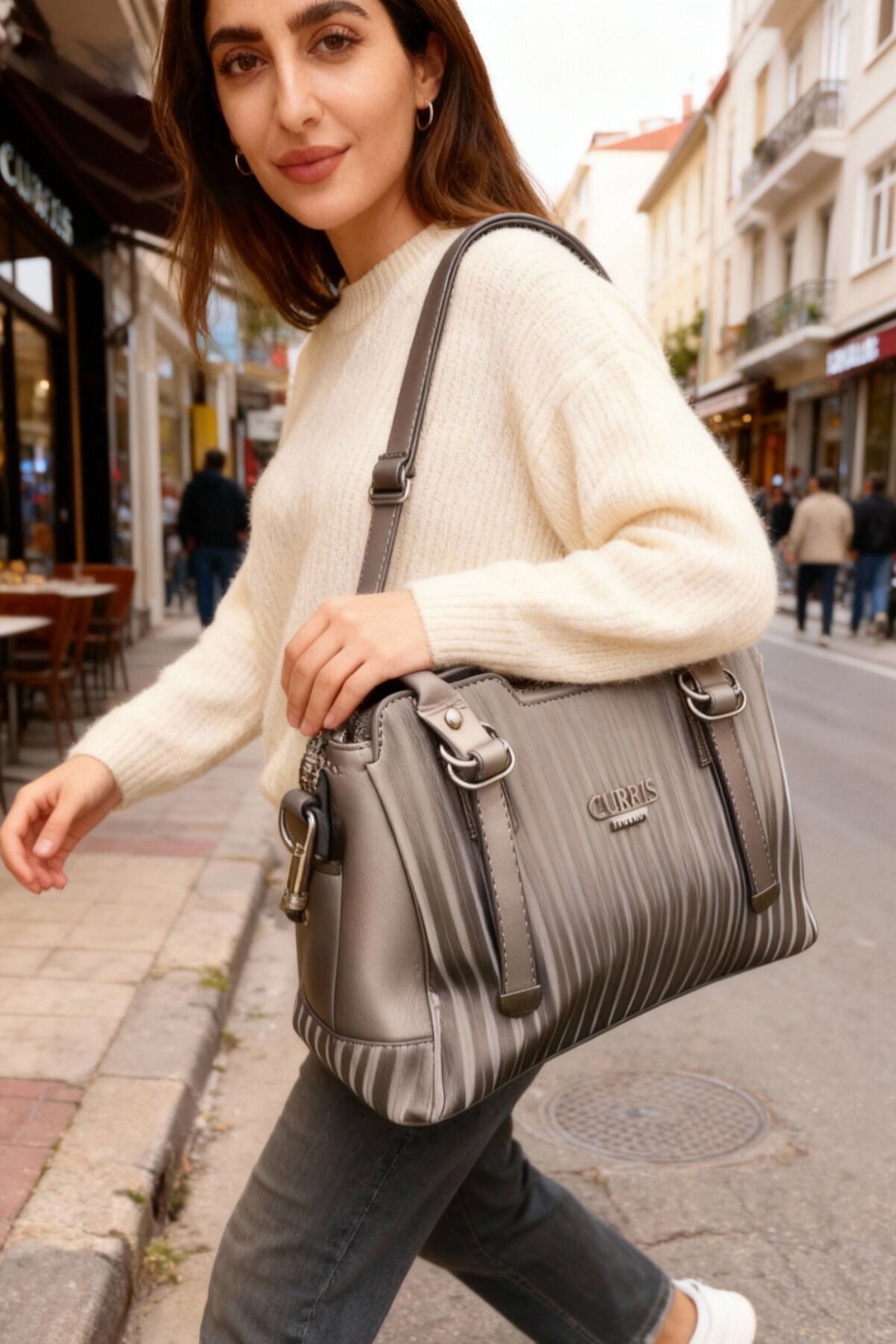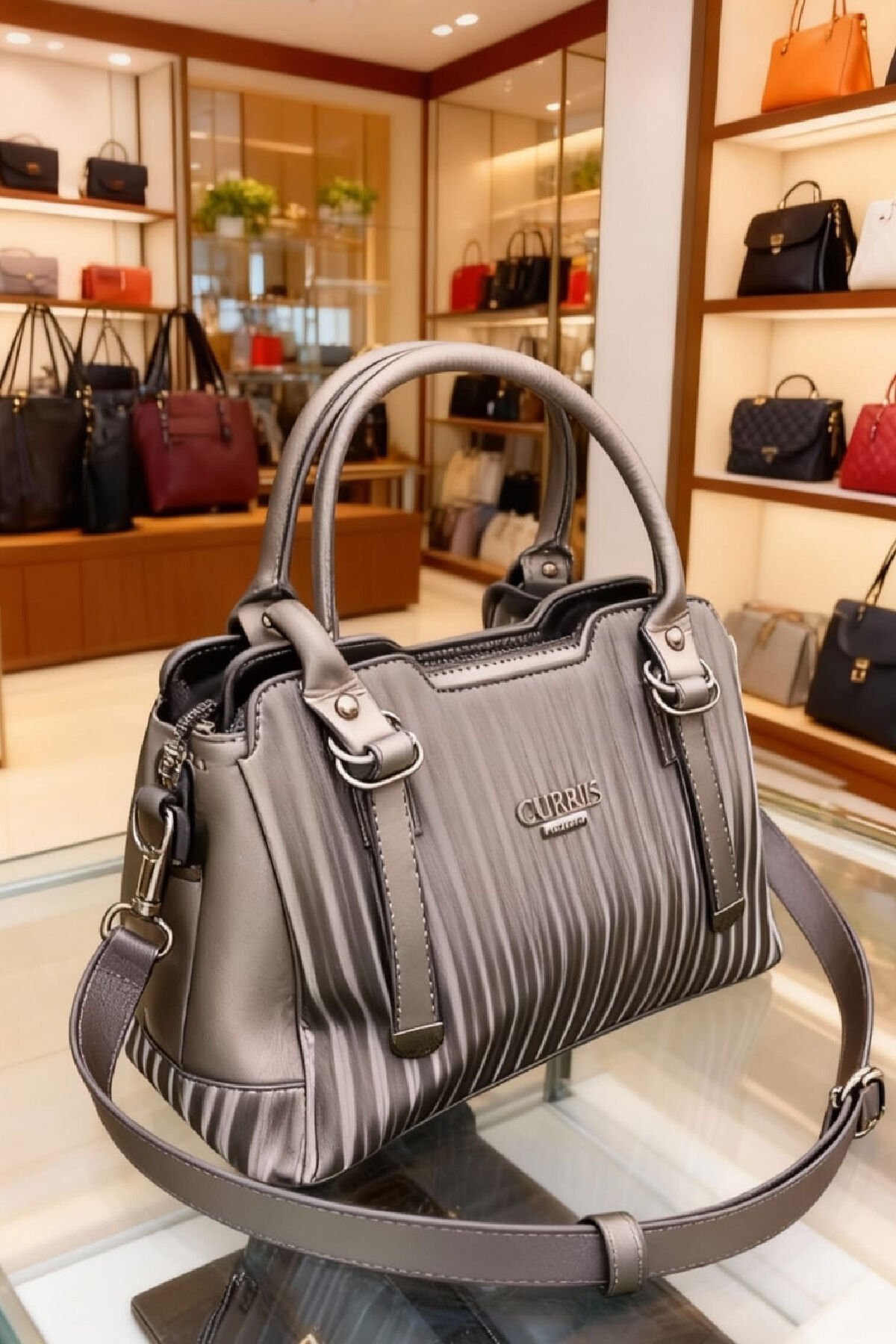 Kadın Metalik Gri Çizgili Omuz ve El Çantası – Şık Günlük Kombin Çantası