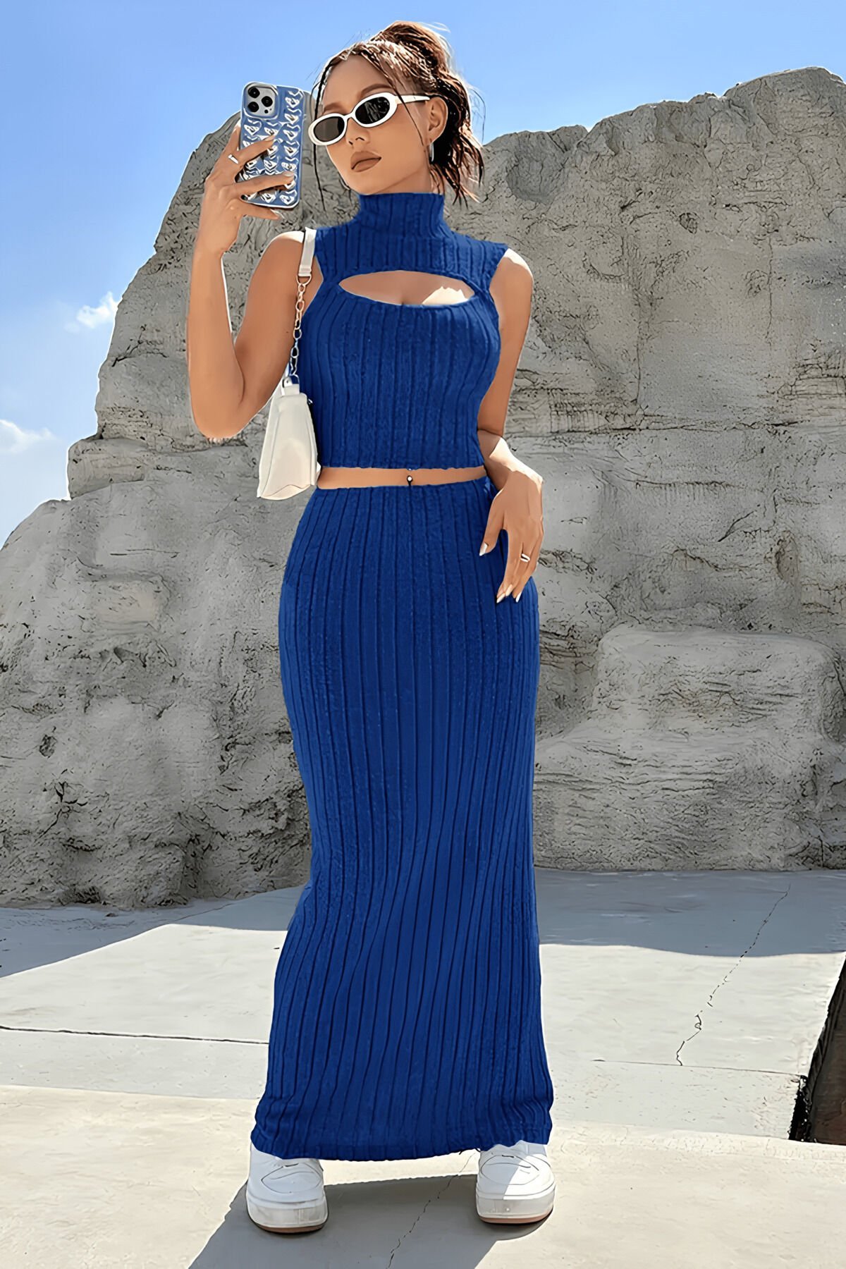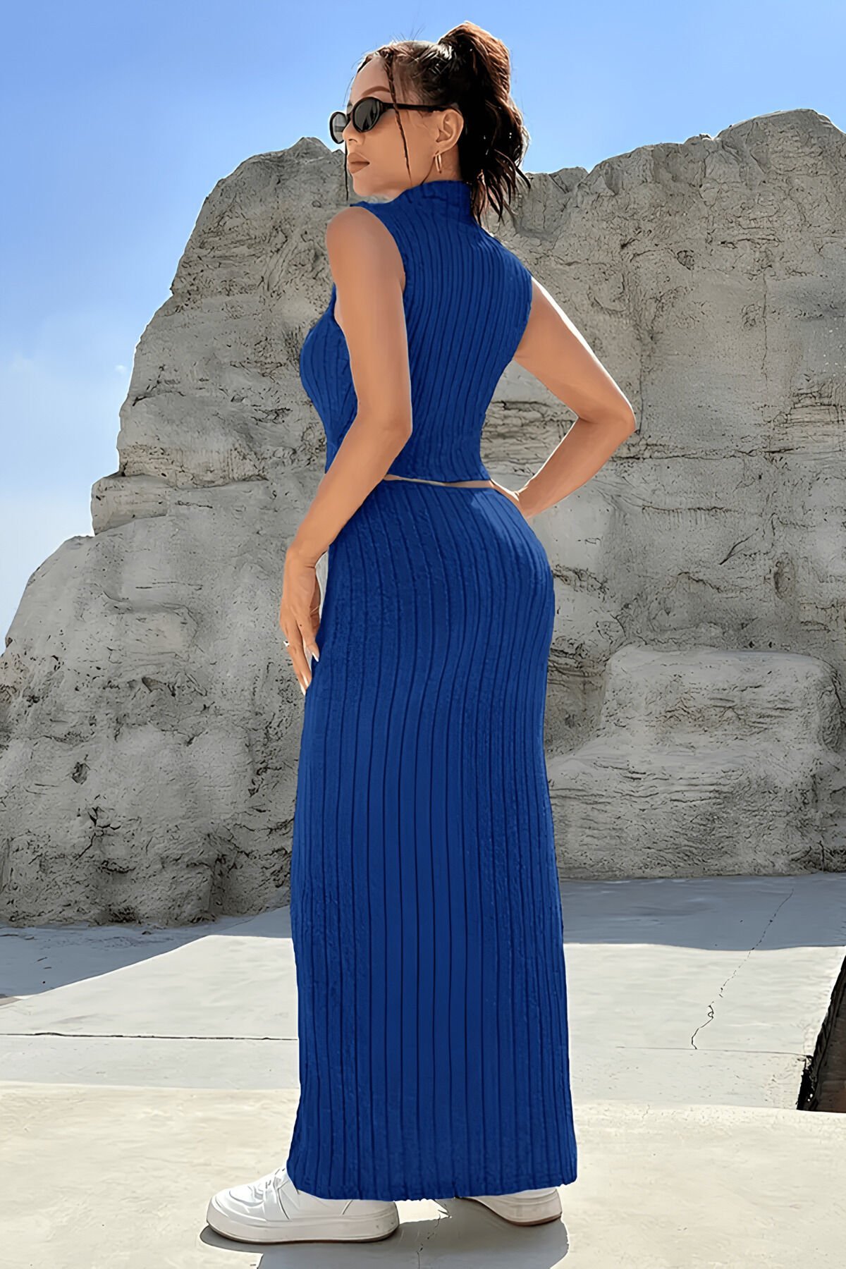 Kadın Saks Mavi Triko İkili Takım – Yırtmaçlı Uzun Etek ve Göğüs Detaylı Kolsuz Bluz
