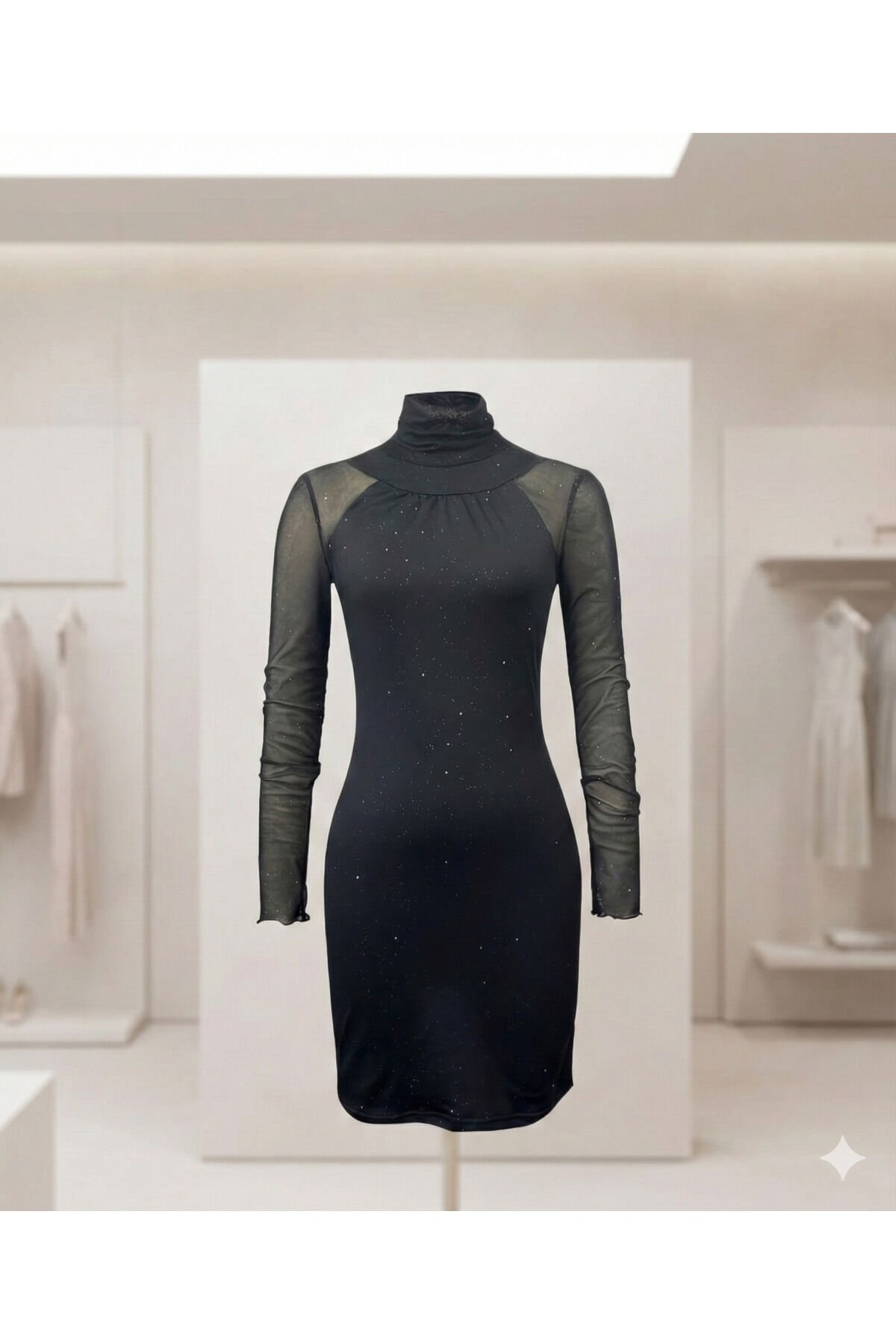 Kadın Siyah Balıkçı Yaka Midi Elbise – Transparan Uzun Kollu, Şık ve Modern Tasarım