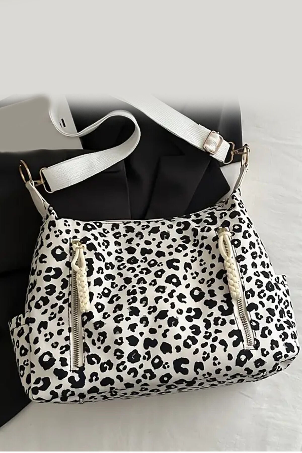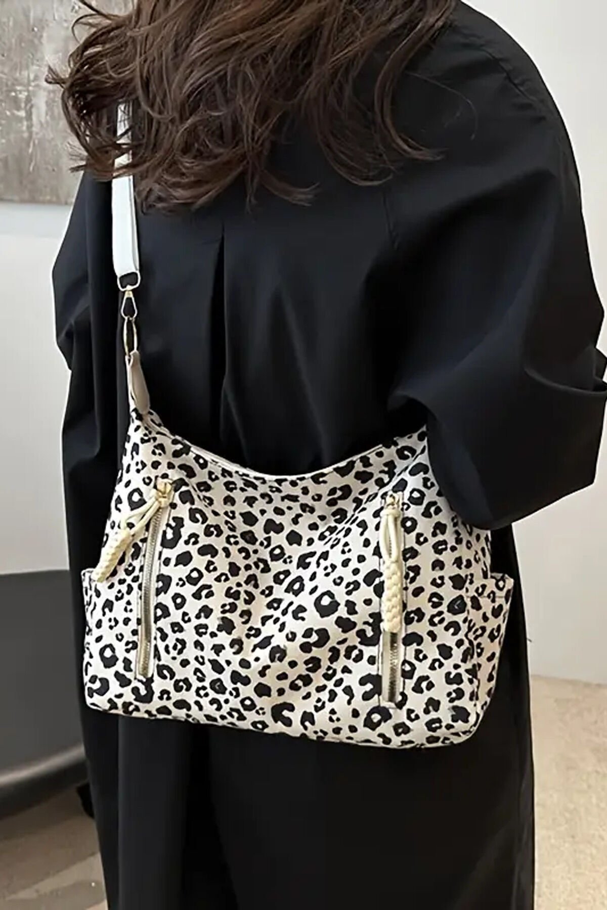 Krem Renk Leopar Desenli Kadın Omuz Çantası - Ayarlanabilir Şık Tasarım