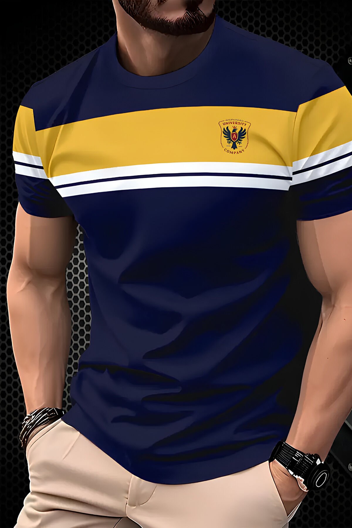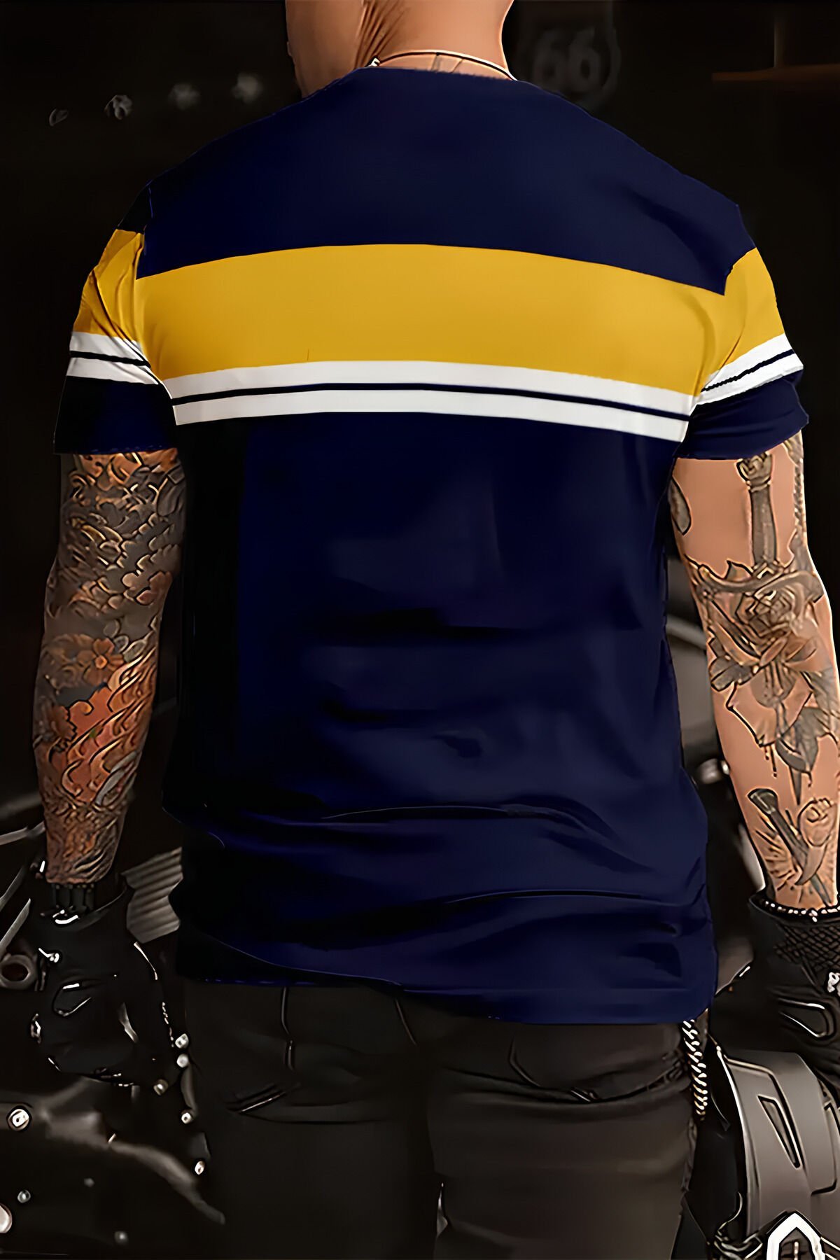 Lacivert Sarı Renk Bloklu Erkek Tişört/T-Shirt – Slim Fit Spor Tarz