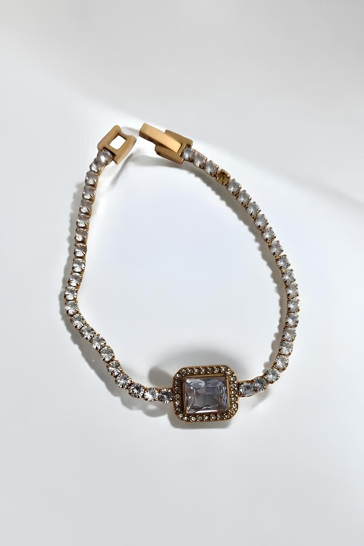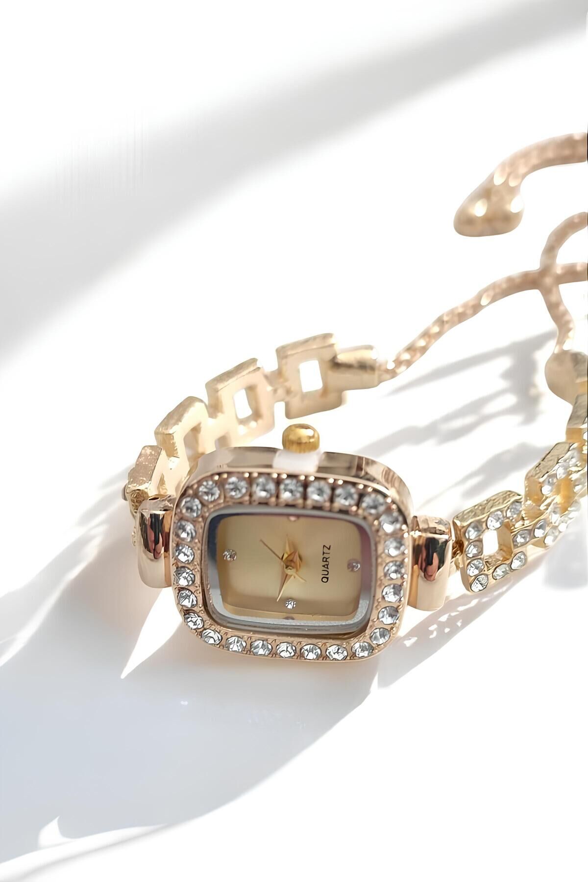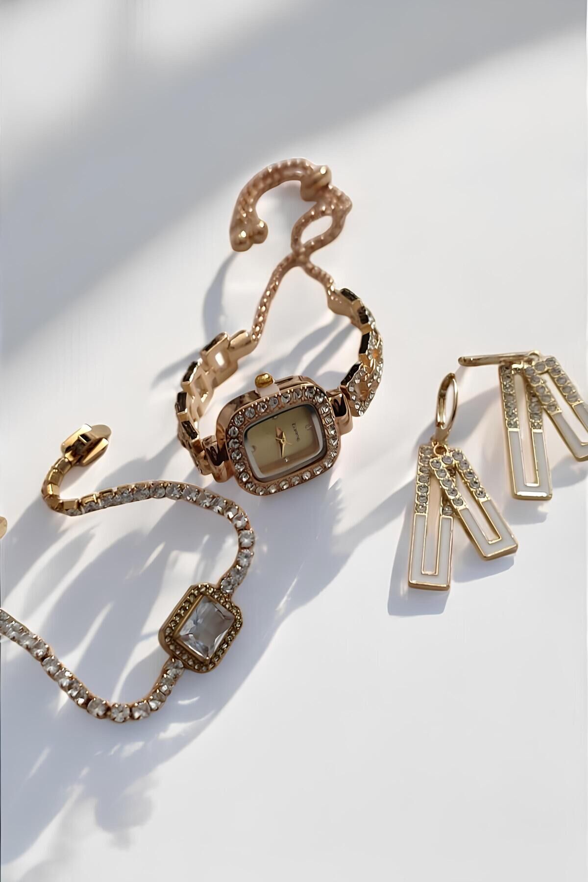 Lüks Taşlı Kadın Aksesuar Seti – Altın Kaplama Renk Saat, Bileklik ve Küpe Takımı