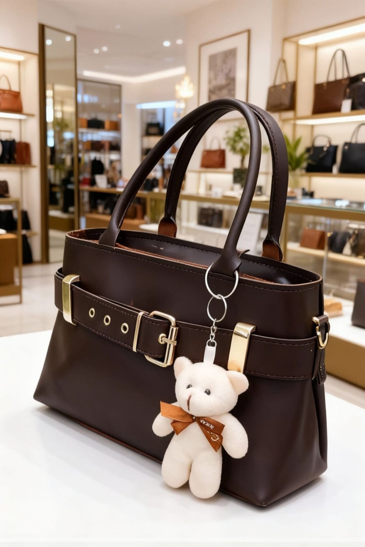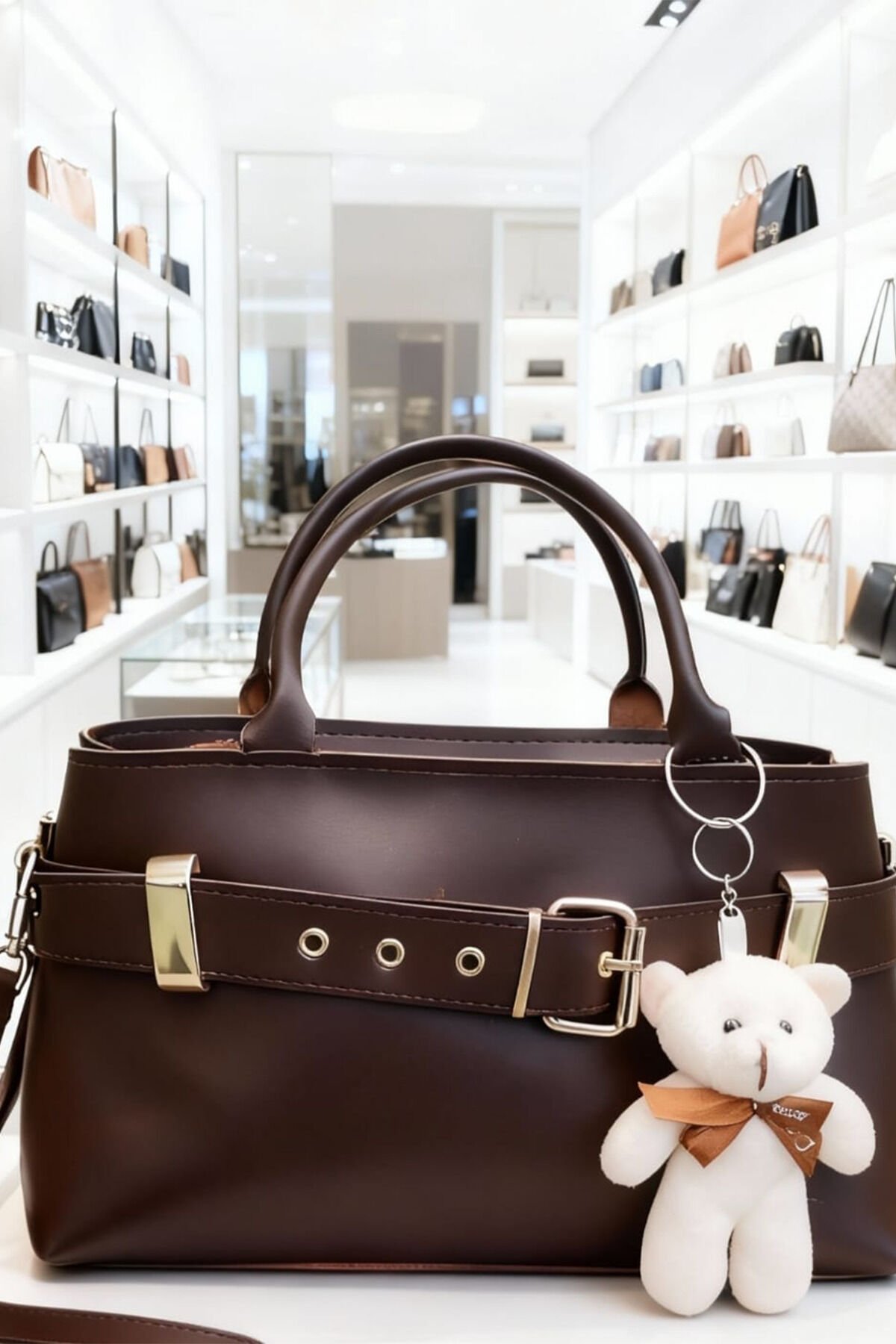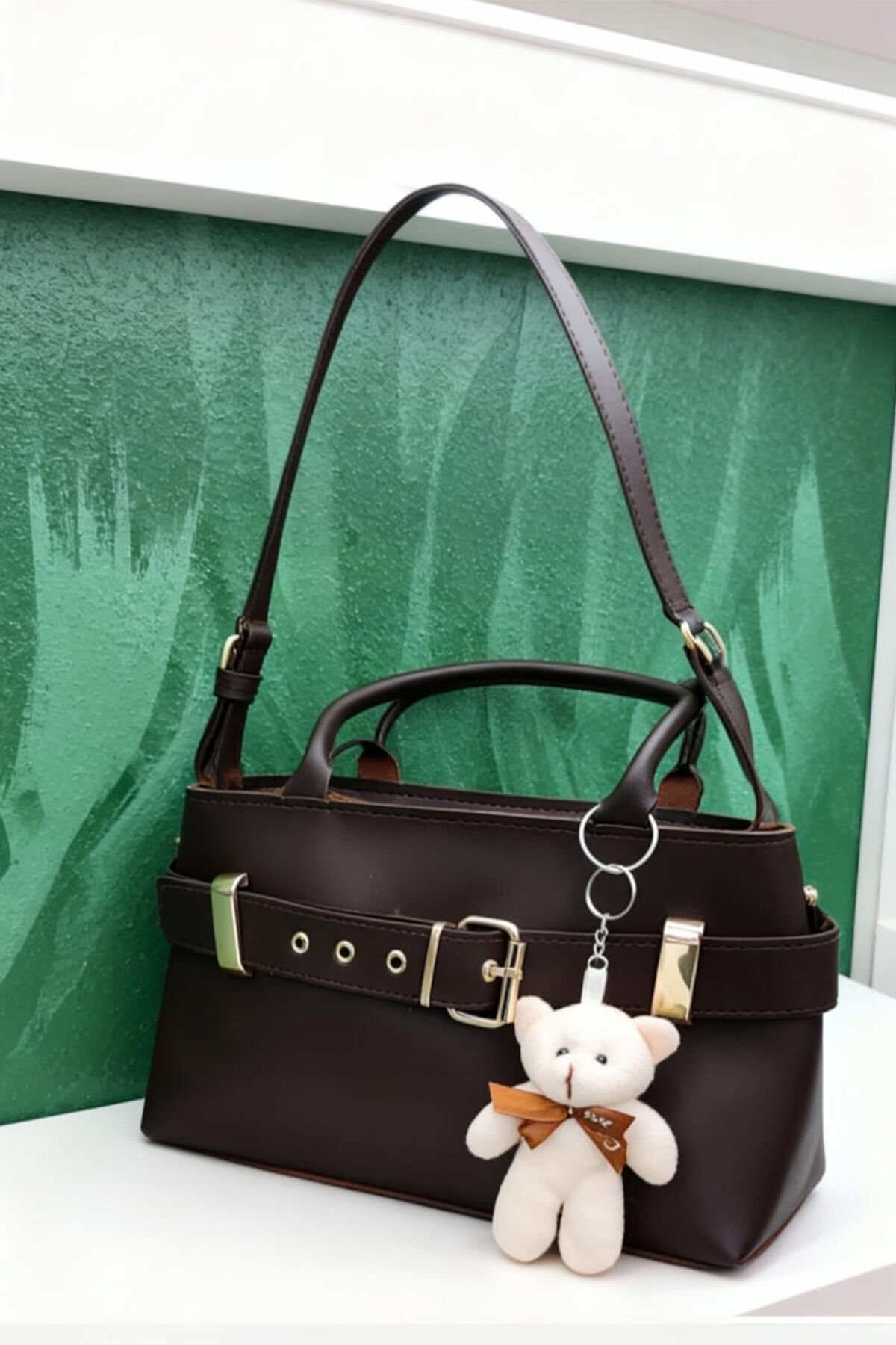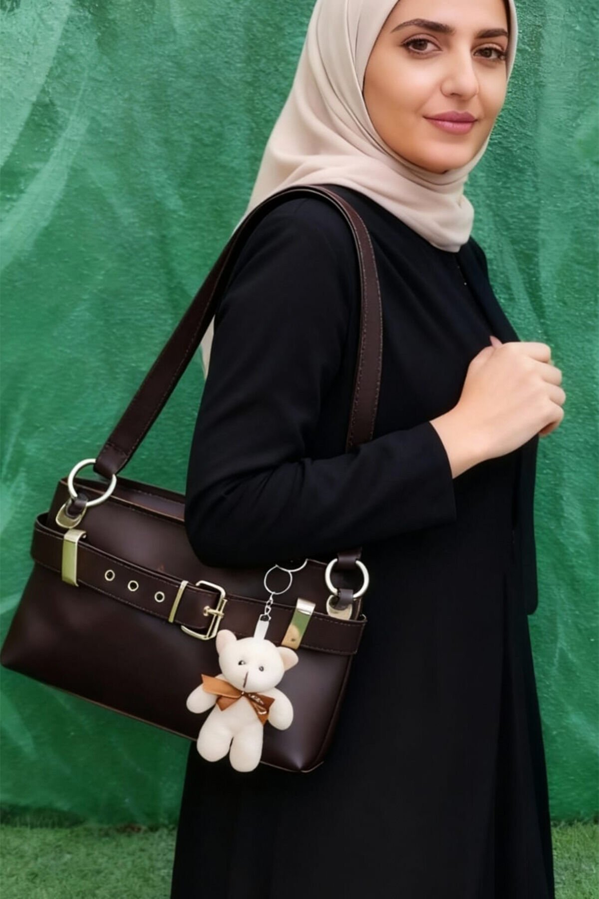 Peluş Ayı Charmlı Kadın Omuz Çantası – Siyah Suni Deri & Peluş Ayıcık Detaylı