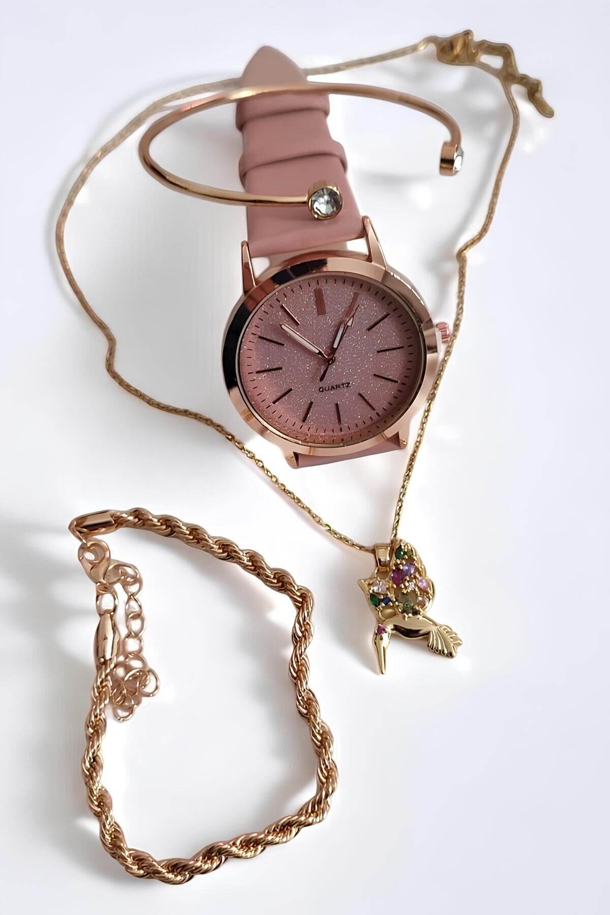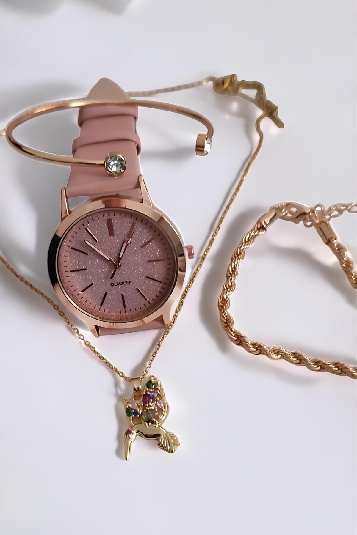 Pembe Renk Kadın Saat ve Takı Seti – Şık Kolye, Bileklik ve Bilezik Kombini
