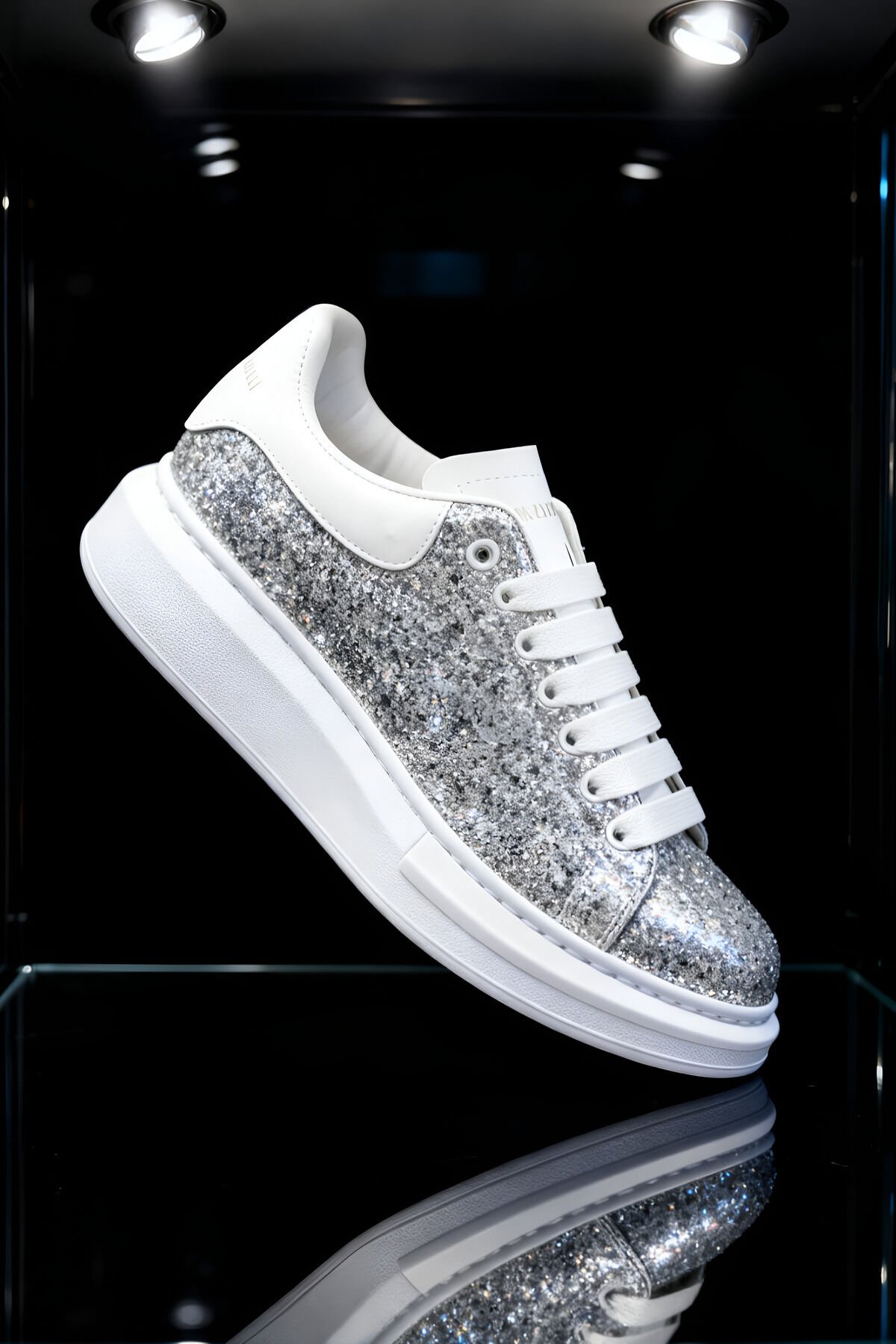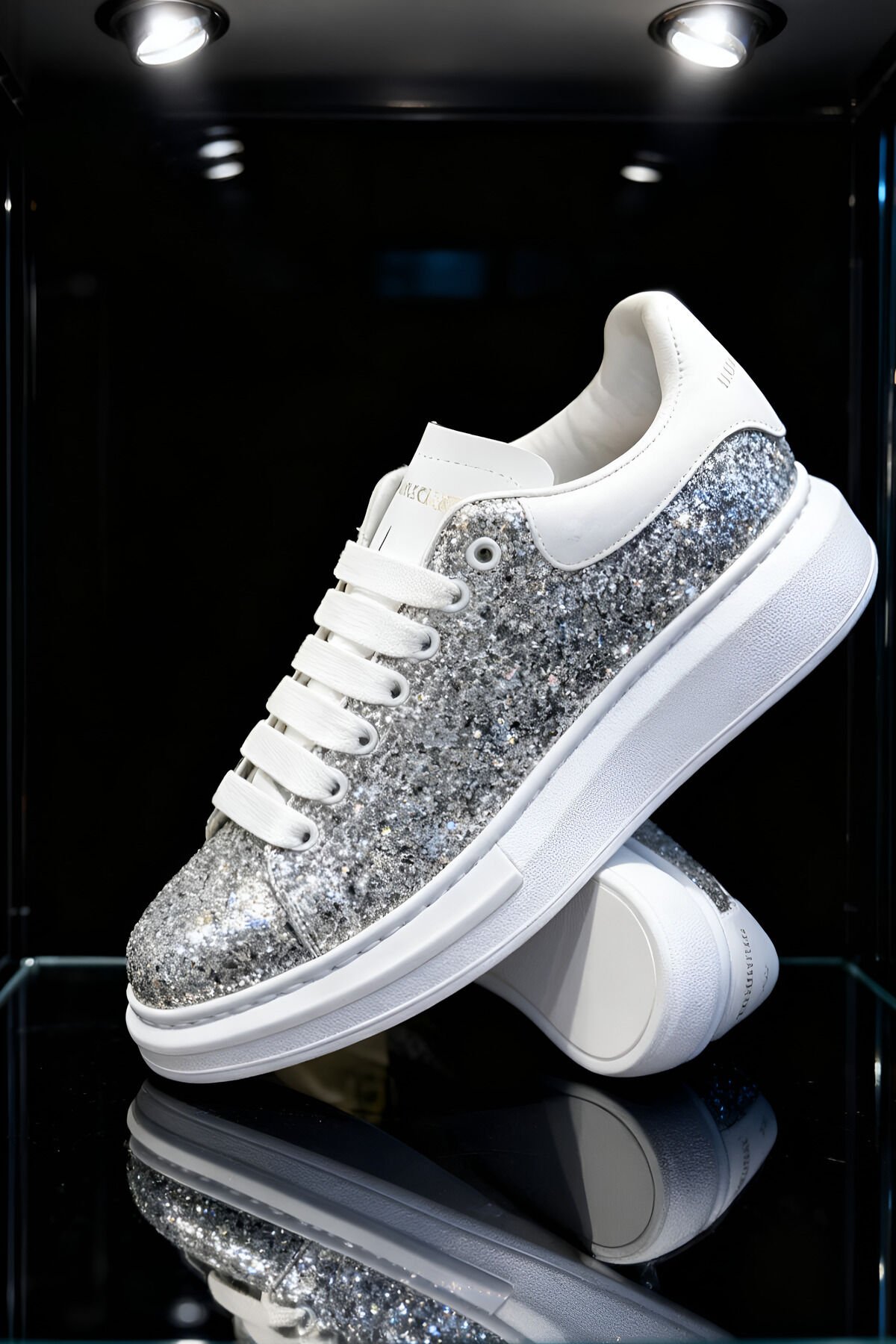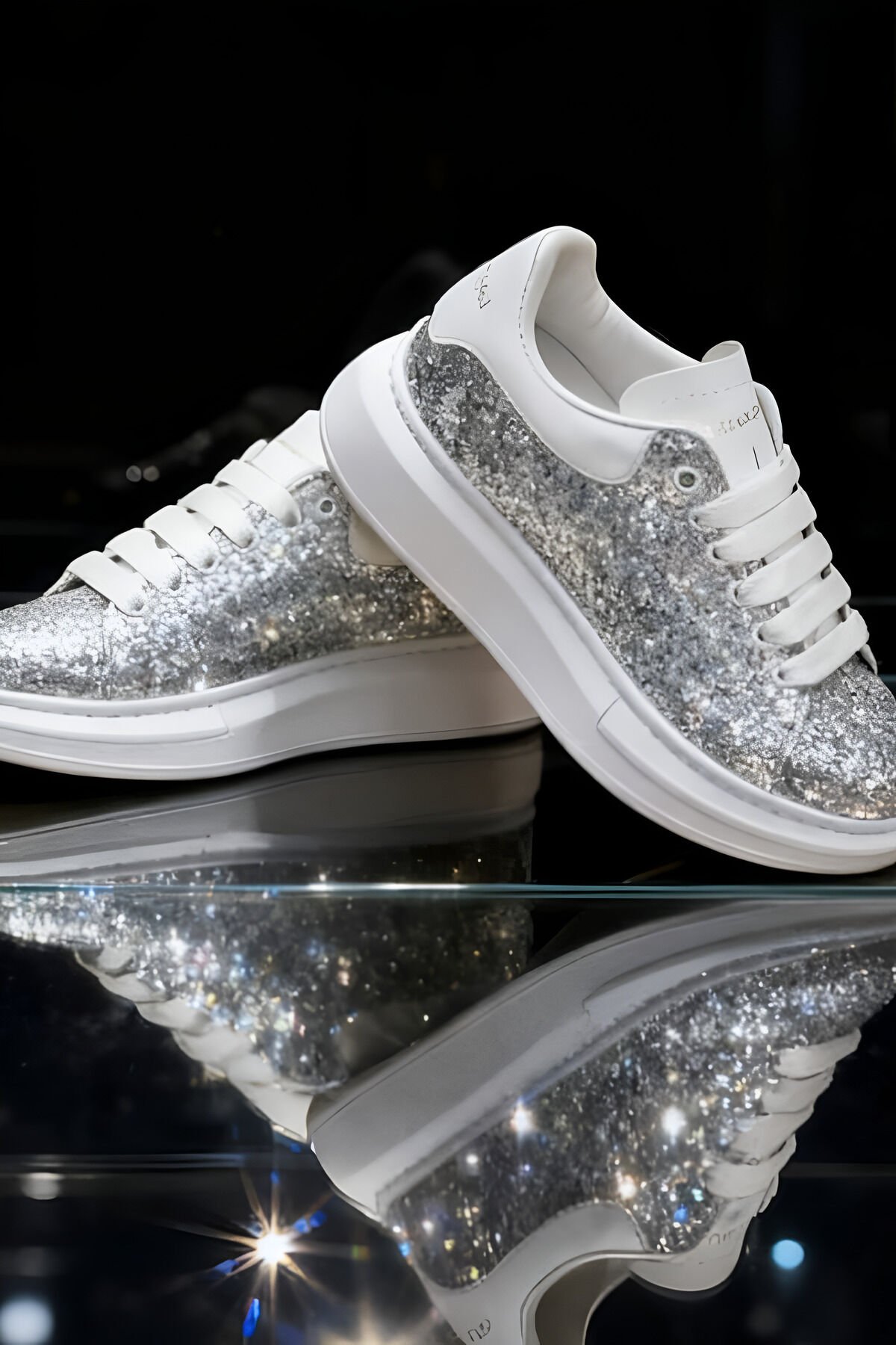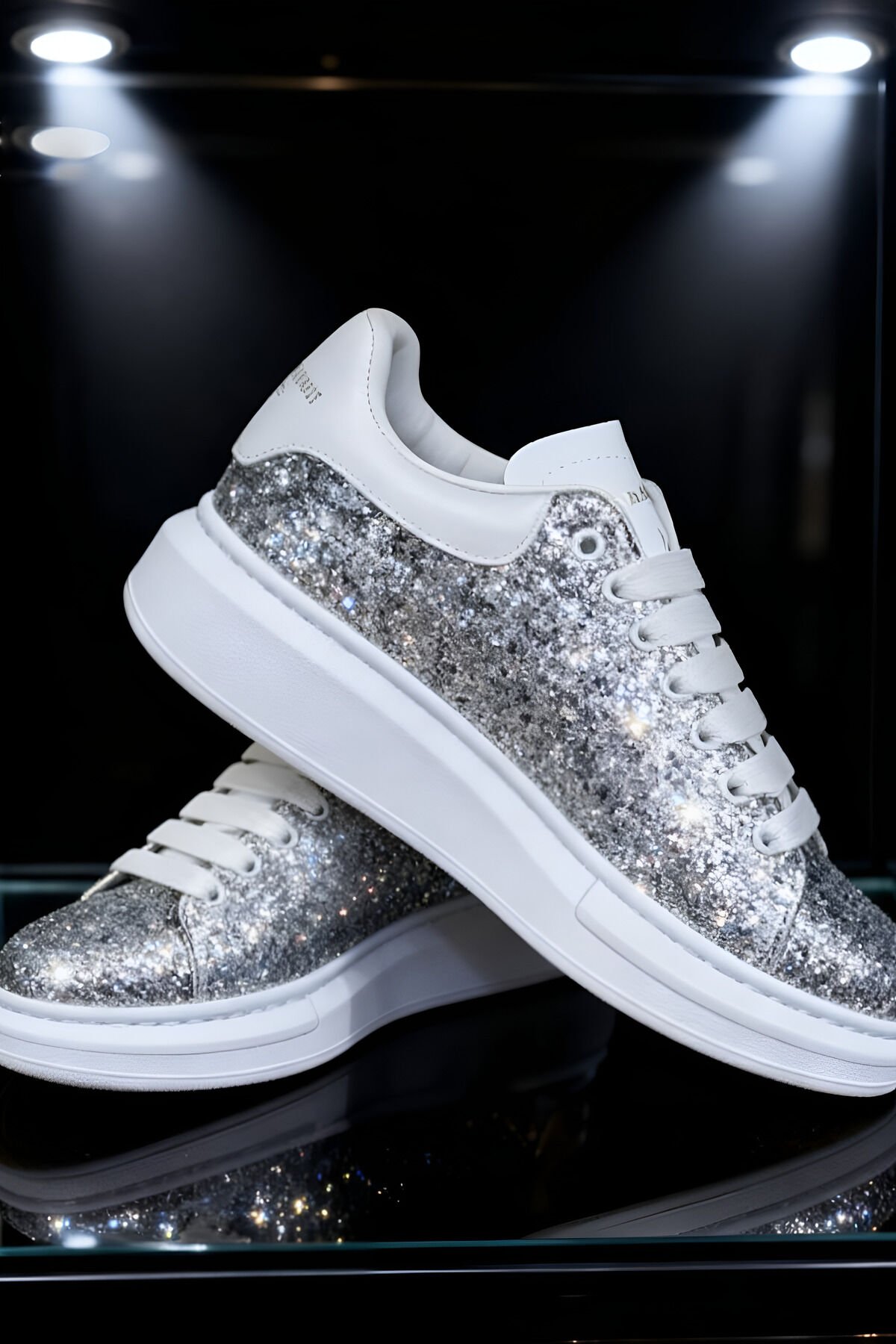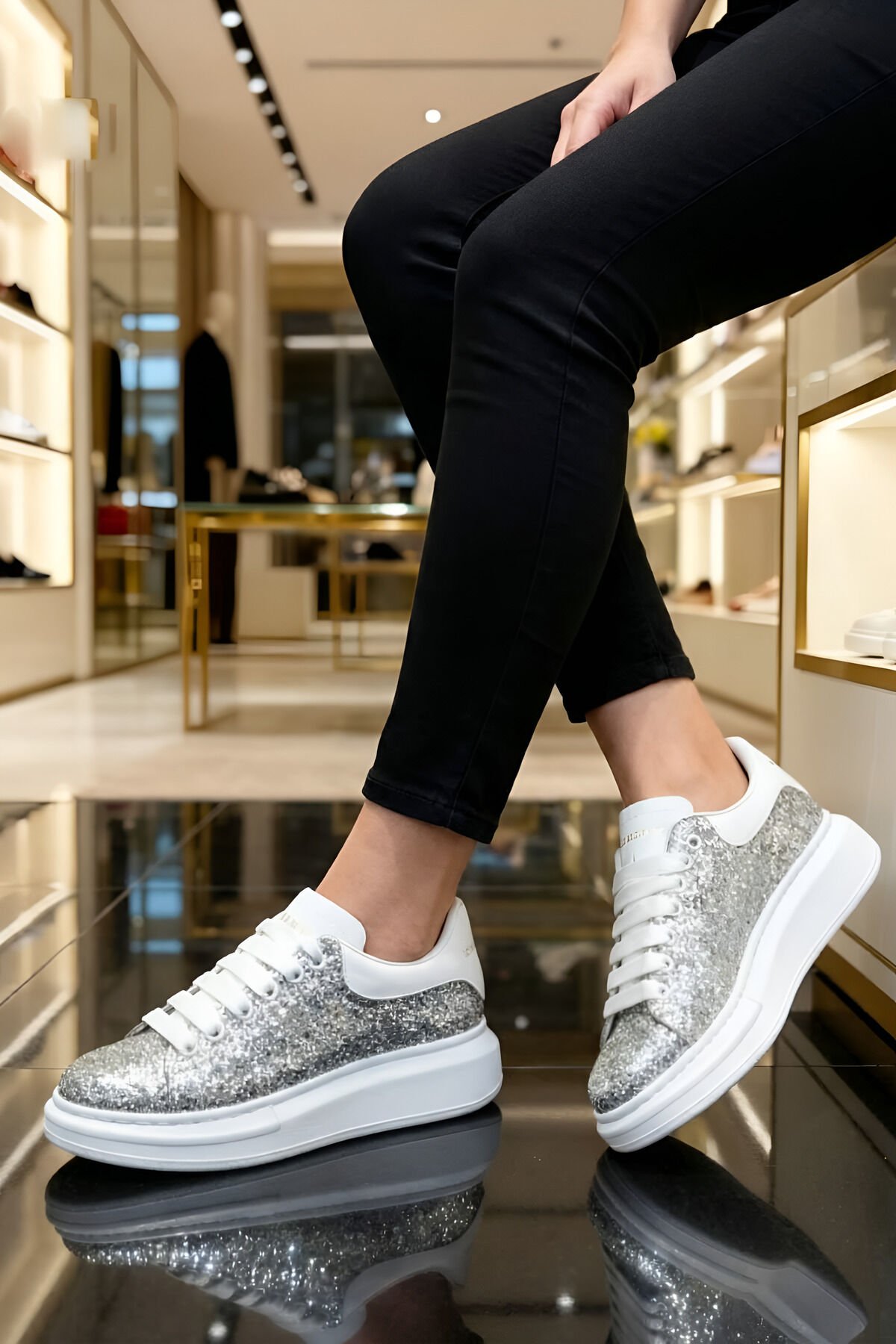 Simli Gümüş Kadın Sneaker Ayakkabı – Kalın Taban, Şık & Modern Tasarım