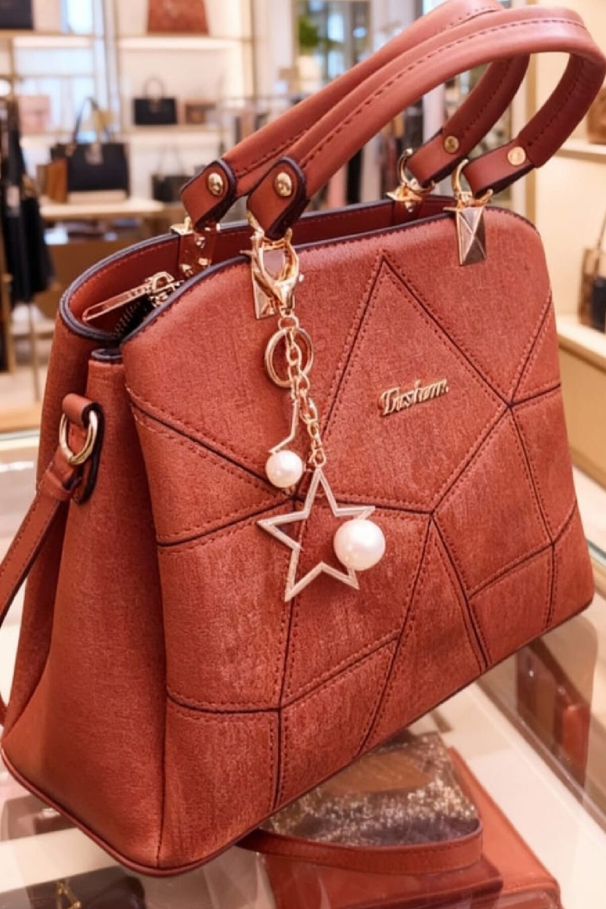 Taba Renk Kadın El ve Omuz Çantası – Yıldız ve İnci Aksesuar Detaylı, Geometrik Dikişli Şık Model