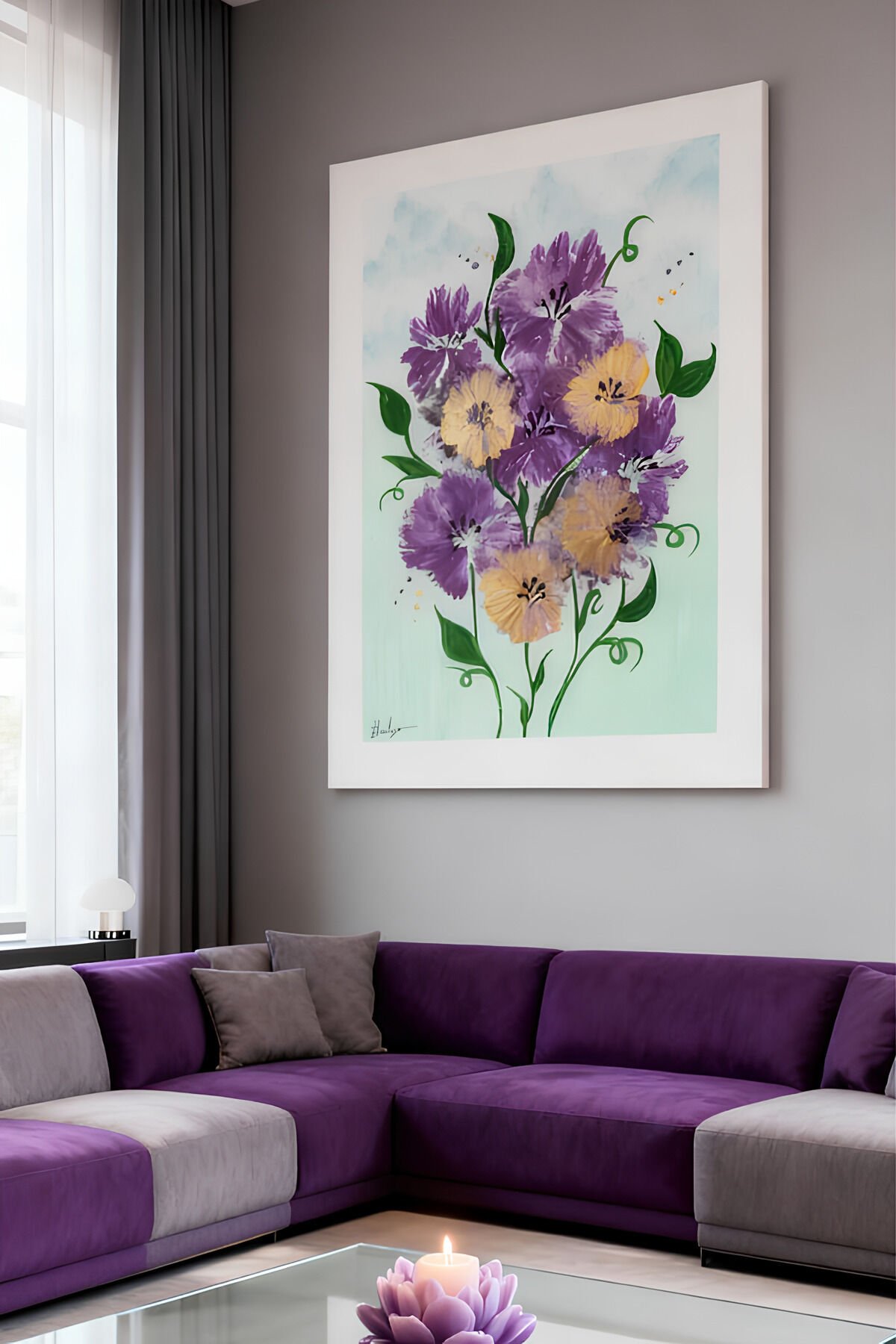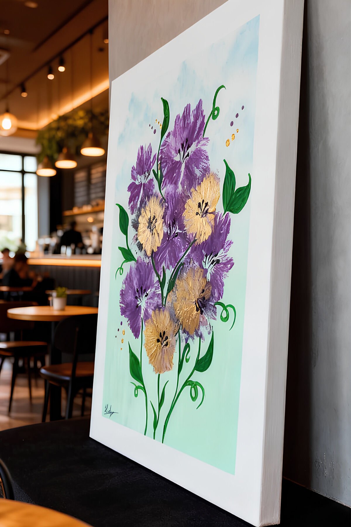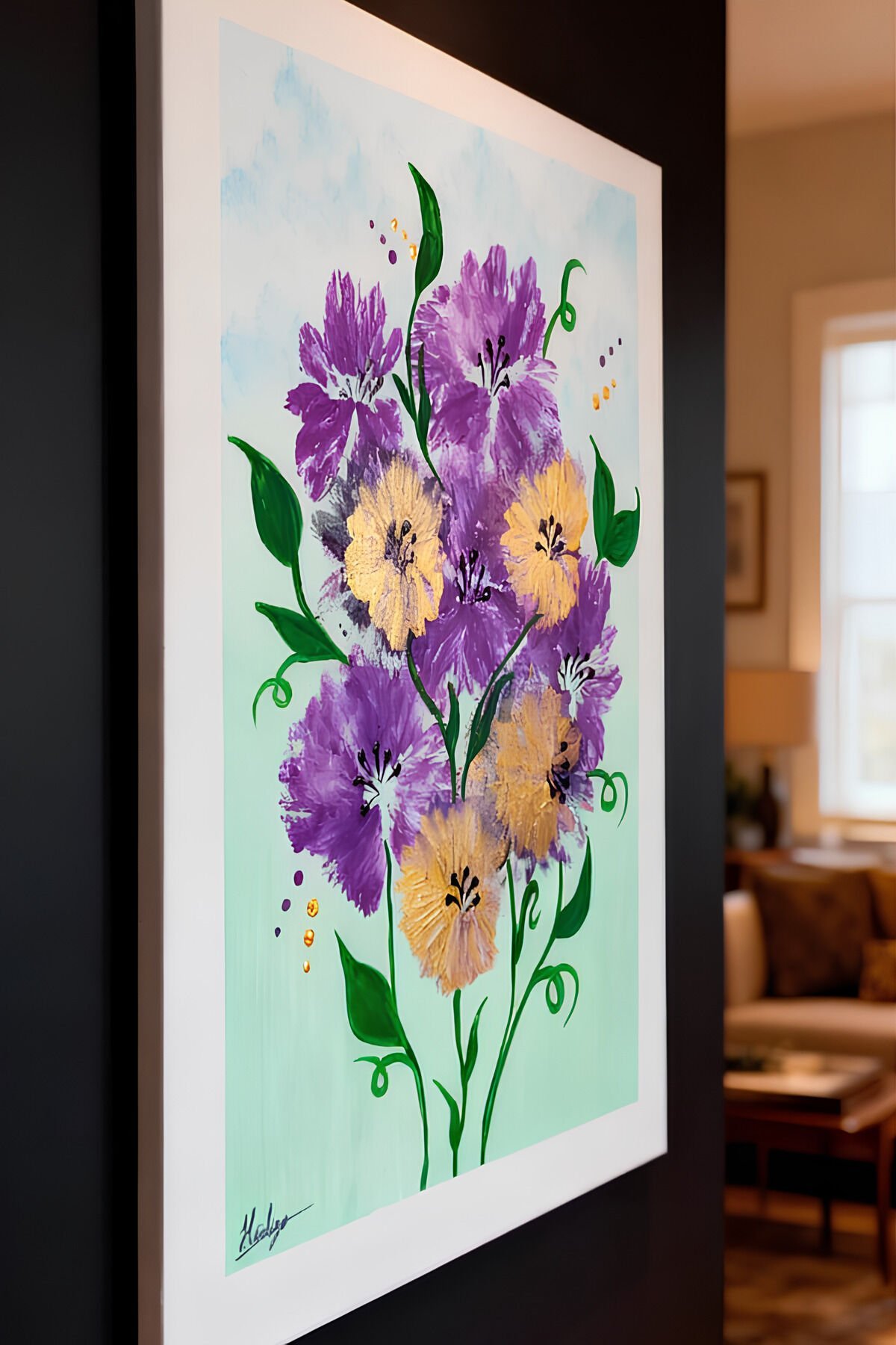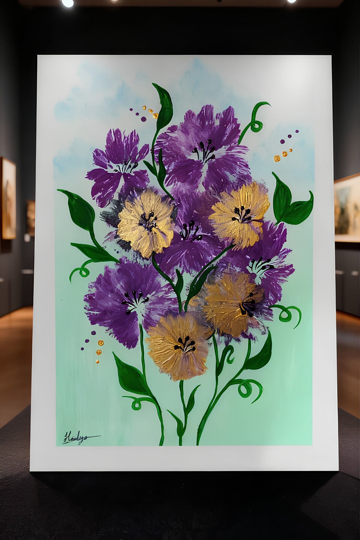 Tamamen El Yapımı, Mor ve Altın Çiçekler – Modern Soyut Çiçek Tablosu, Duvar Dekoru (35x50)