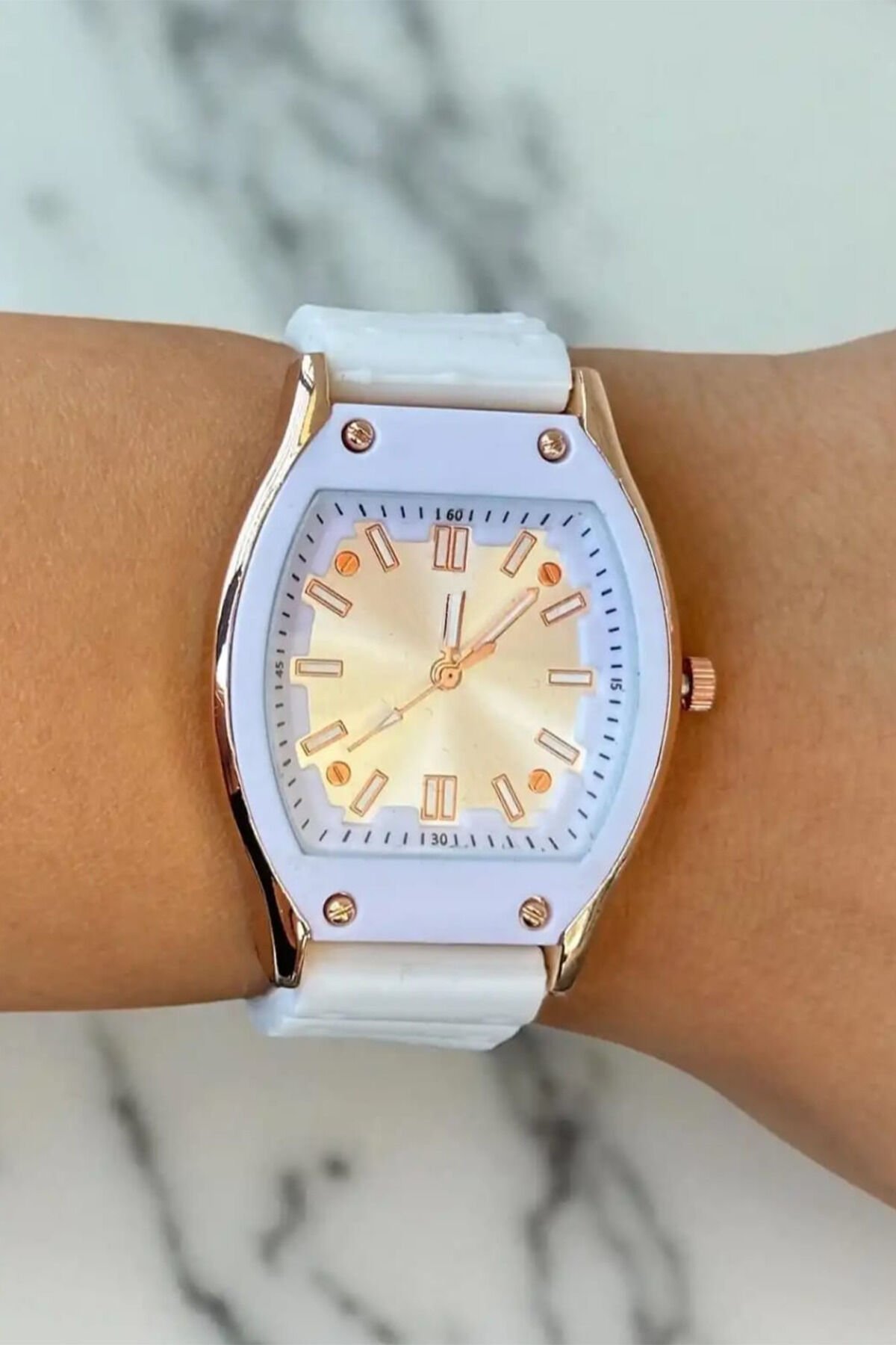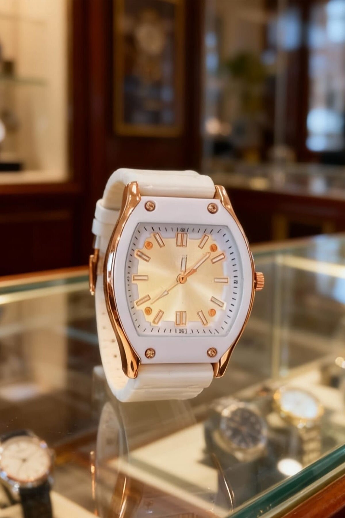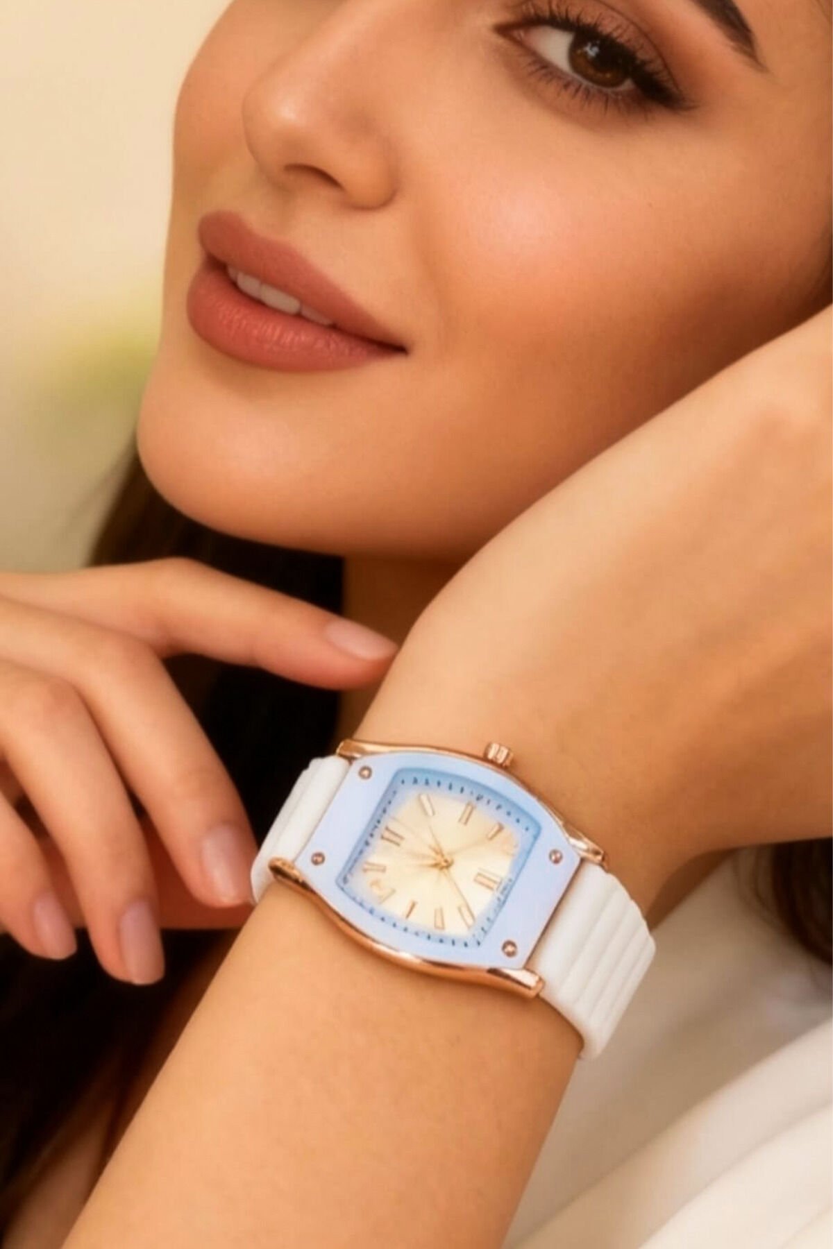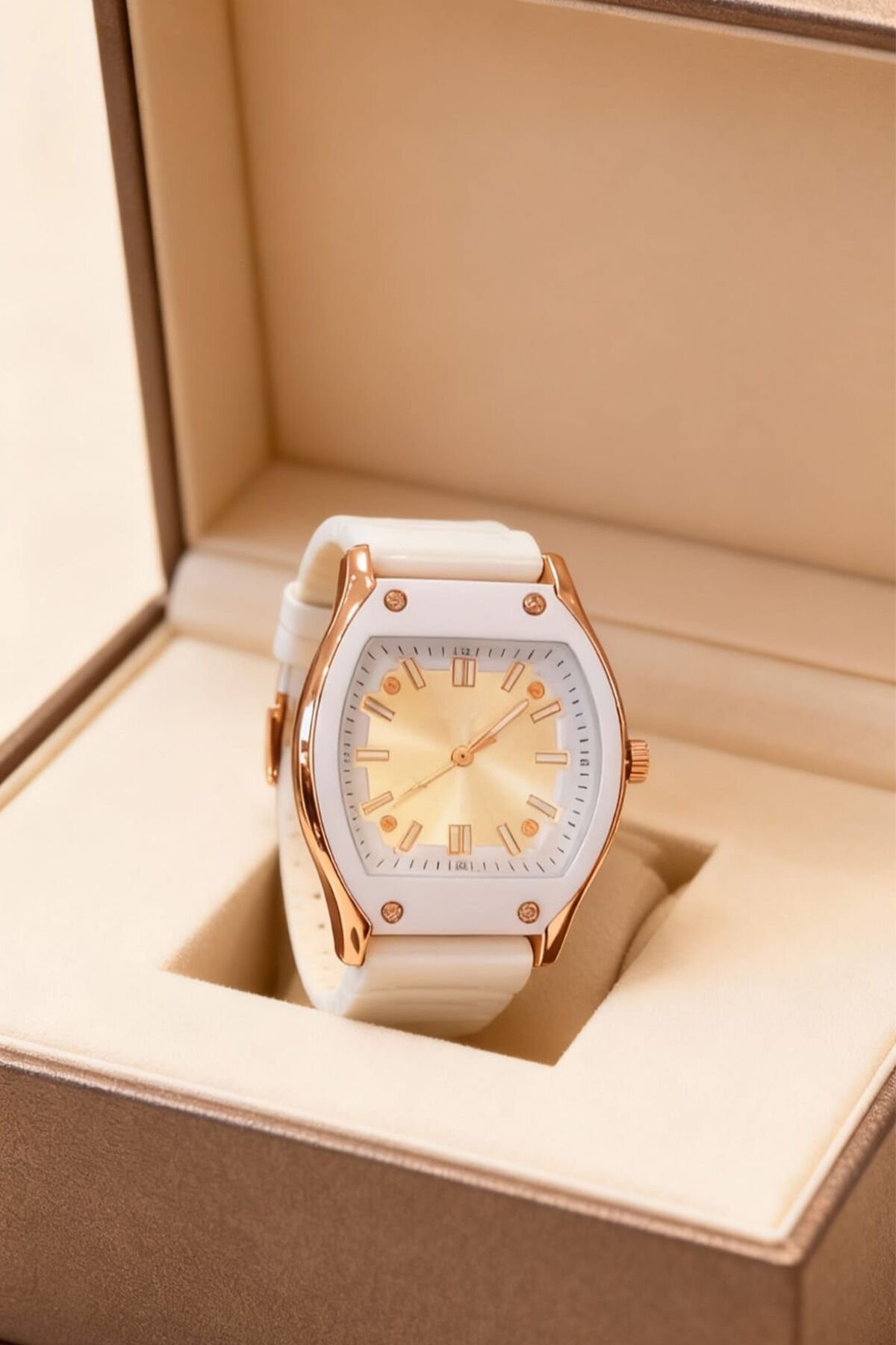Turkuaz, Rose Gold Kare Kasa Kadın Kol Saati – Beyaz Silikon Kordon, Şık & Modern Tasarım