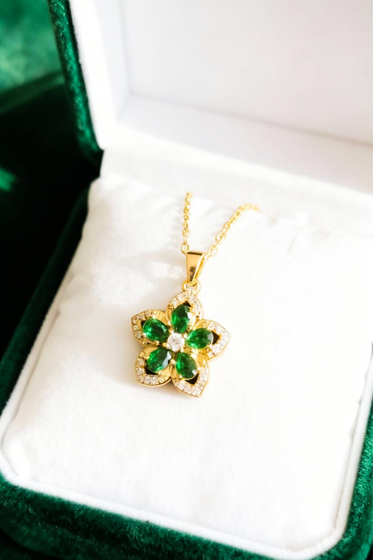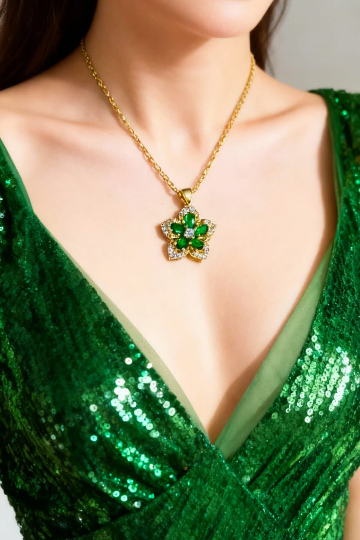 Yeşil Çiçekli Altın Renk Zarif Kolye (Çelik Malzeme)