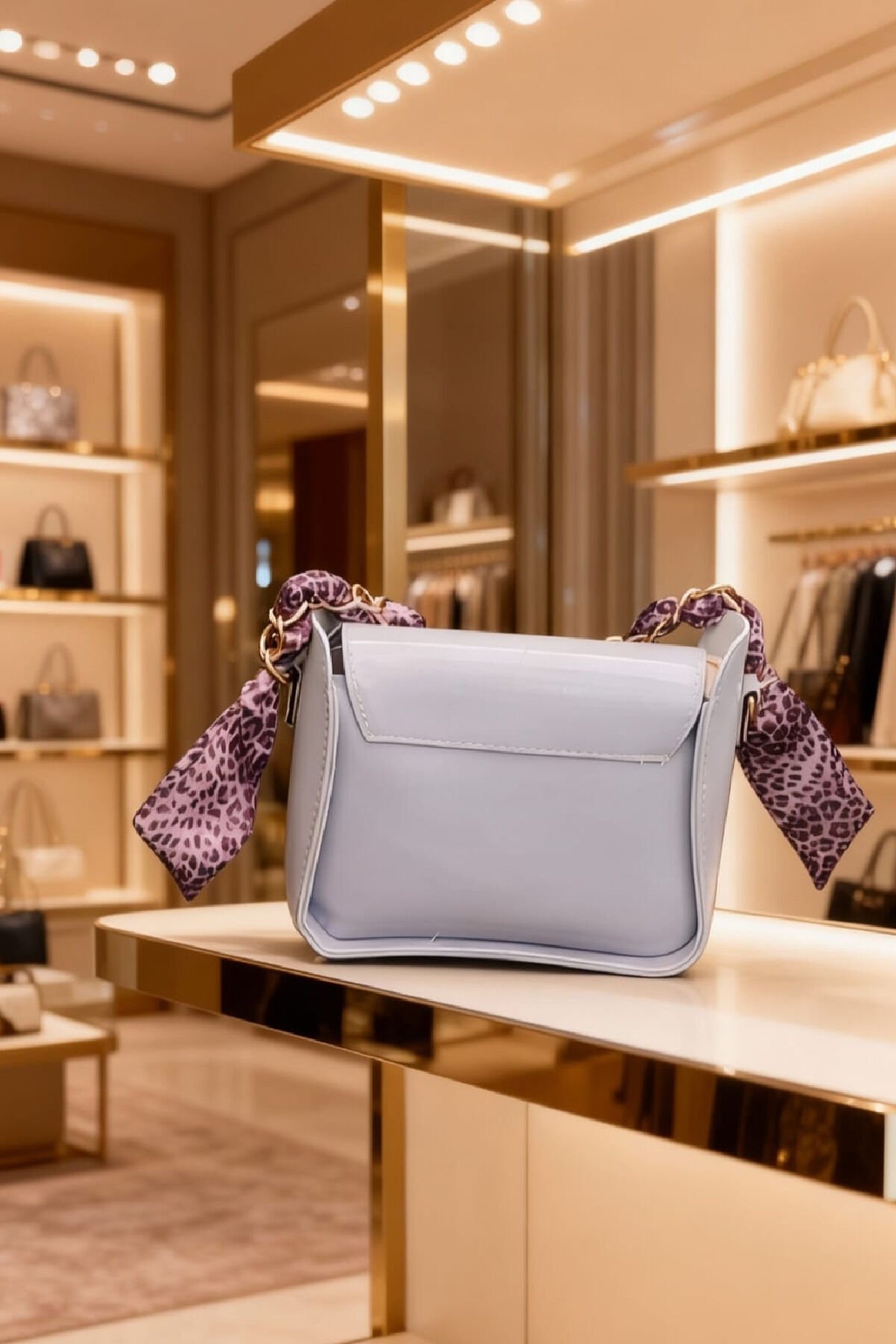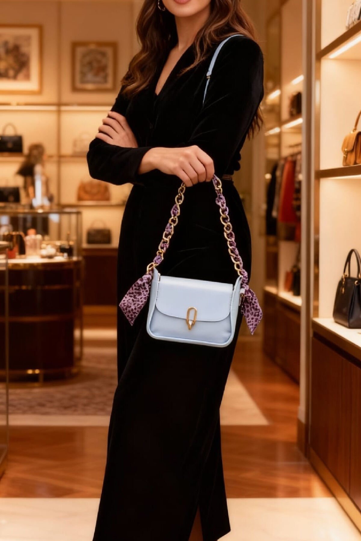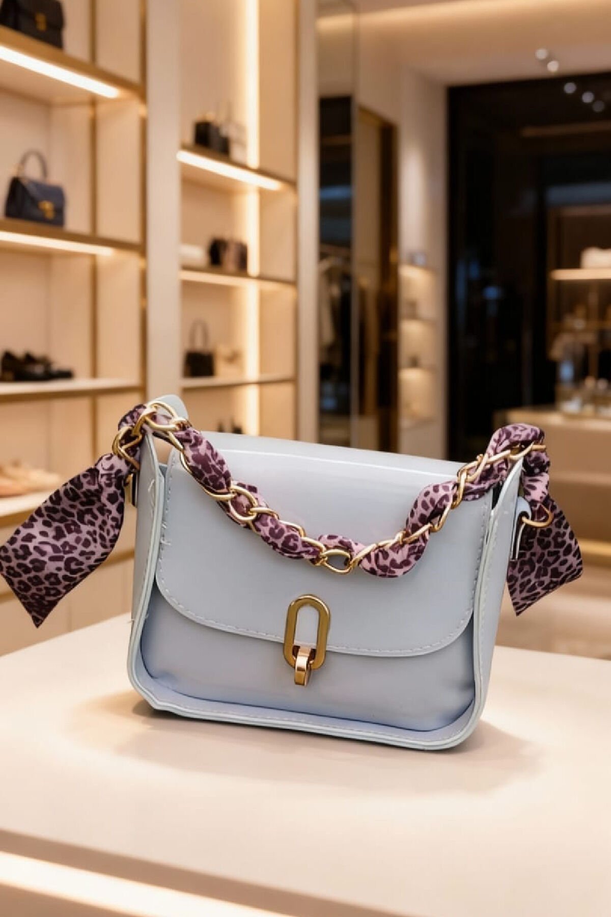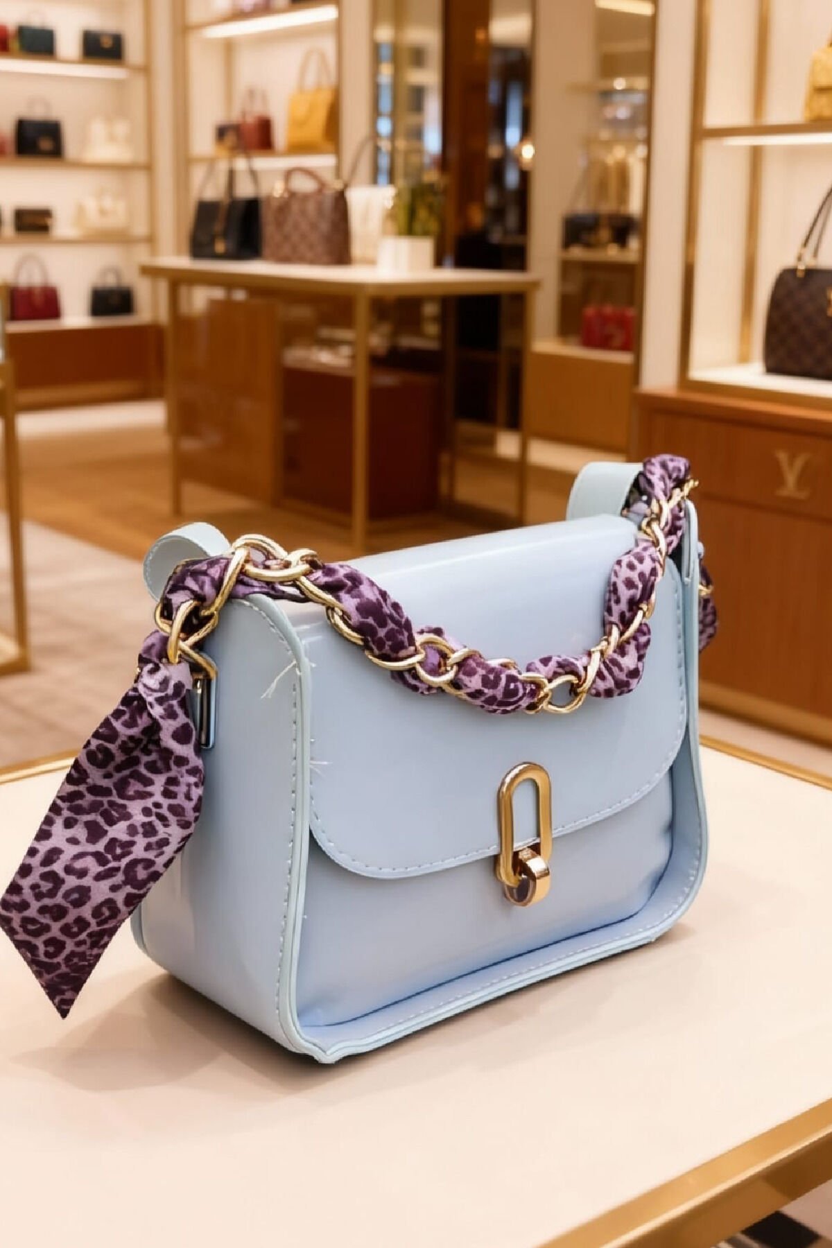 Zincir Askılı Mavi Kadın Omuz Çantası – Parlak Deri Görünümlü, Leopar Desenli Şık Aksesuar