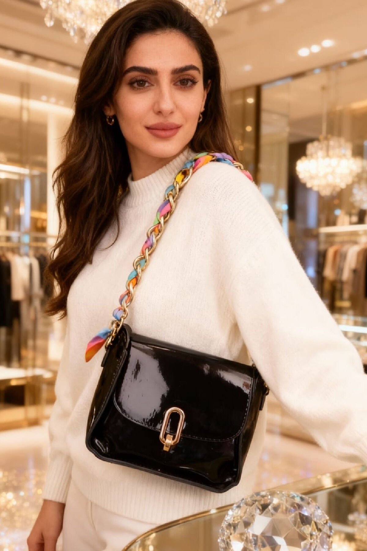 Zincir Askılı Siyah Kadın Omuz Çantası – Parlak Deri Görünümlü, Leopar Desenli Siyah Şık Çanta
